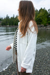 It as two large pockets on the front. It is perfect to overlaid and can be worn like a light jacket in the fall.