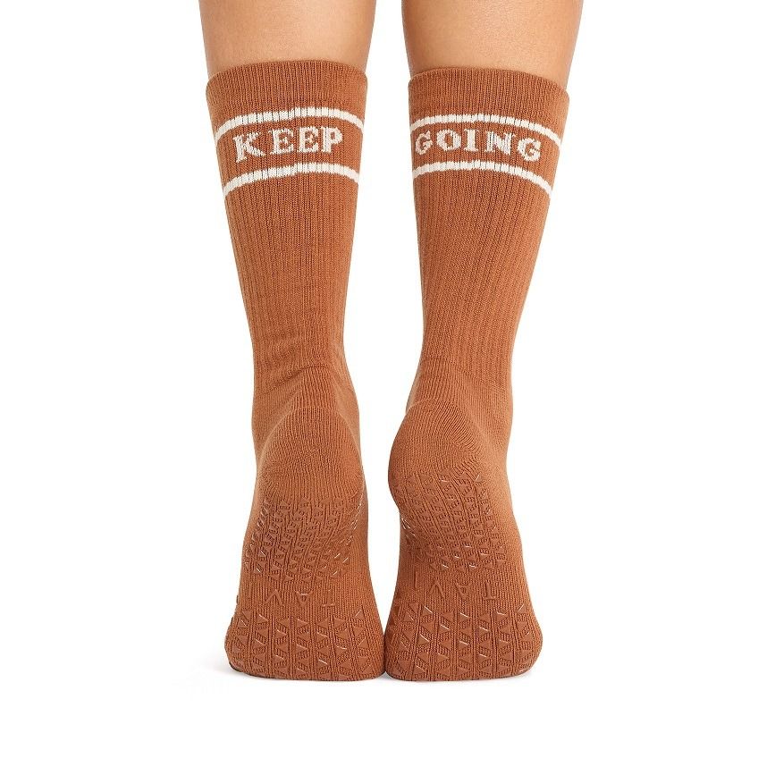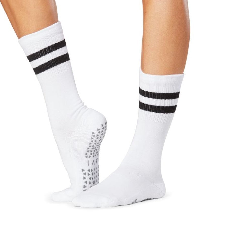The TAVI Kai Grip Socks bring a classic athletic feel with sporty stripes and a timeless crew height. Designed to hit mid-calf, they offer the perfect blend of style and function. Featuring TAVI’s high-density rubber grip sole, these socks provide secure footing to keep you steady through every barre, Pilates, and yoga session. Simple, cool, and undeniably versatile, this crew-length staple is available in a variety of colors to suit your style.