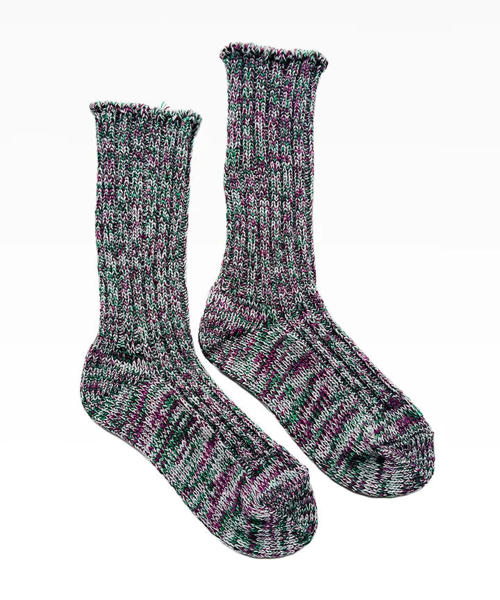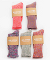 Sunday Socks are colourful little sweaters for your feet. These thick and cozy reading socks are made of 4 different coloured yarns in a fibre mix of cotton, wool and acrylic. Okayok Sunday socks have a colourful, melange, variegated pattern. Made at a small sock factory in Brampton, Ontario.