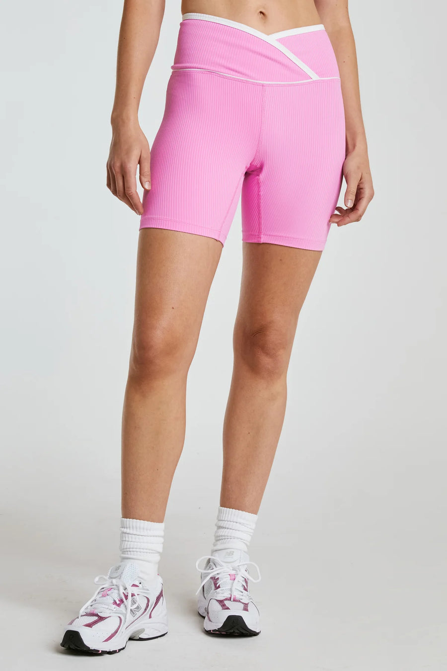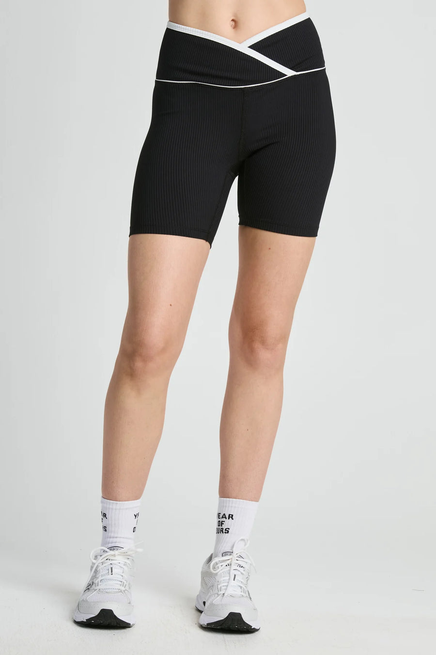 These warm-weather-ready biker shorts stand out with an ultra-flattering wrap-front waistband and contrasting edge detail, adding a stylish twist to a classic silhouette. Made from Year of Ours signature Active Ribbed fabric, they offer breathable support and moisture-wicking performance to keep you dry and comfortable through any workout.