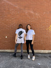 - Miriah and Geneviève (photos 2-3) are wearing the white tee in Small