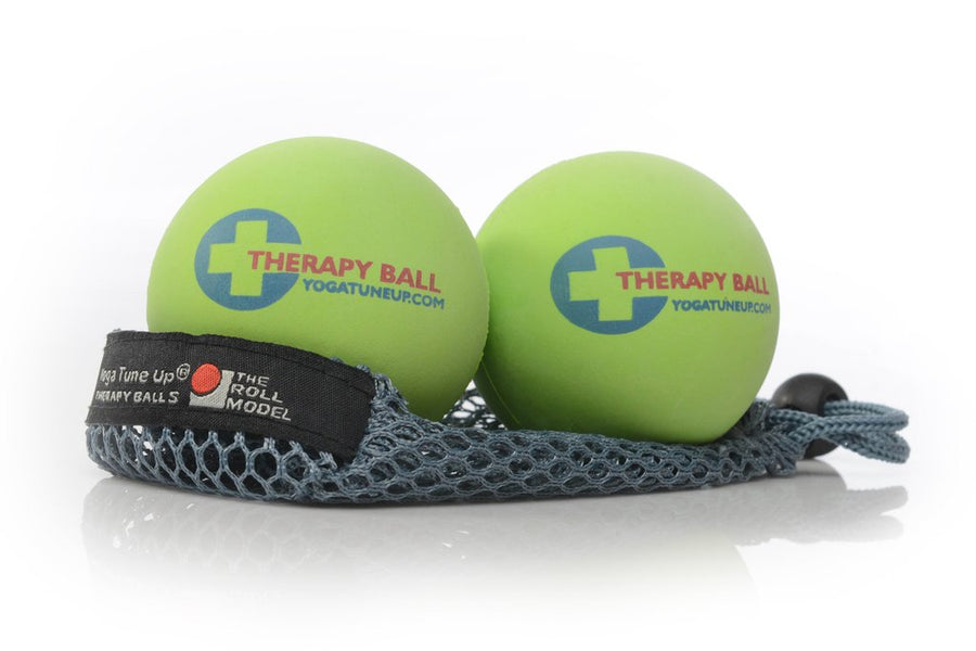 The Yoga Tune Up Therapy Balls measure at about 2 1/2" in diameter each and are made of a special rubber that grips at your skin, grabs at multiple layers of muscles, and rubs out adhesions and tension, providing a deep tissue massage. Includes mesh drawstring snug-grip tote.